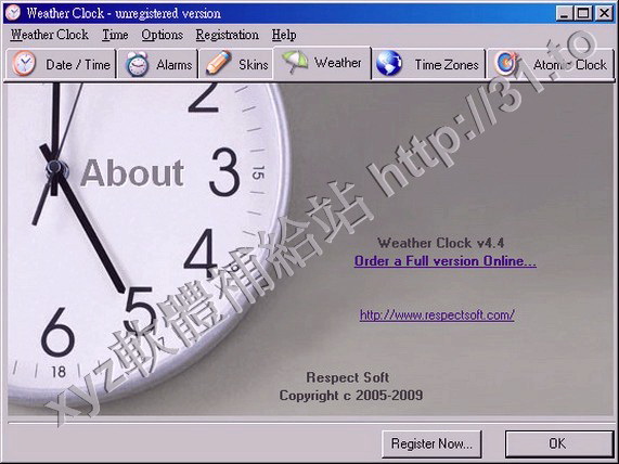 • Respect Soft Weather Clock v3.1 英文正式版(能夠顯示時間日期和所在地的溫度和氣象,提示提供鬧鐘功能的軟體)